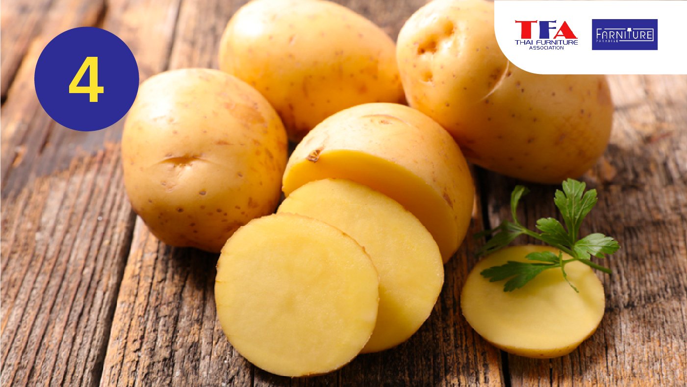 ผ่าแบ่งครึ่งมันฝรั่ง แล้วนำเนื้อในของมันฝรั่งไปถูบนกระจก เทน้ำส้มสายชูตามลงไป ทิ้งไว้ 5 นาทีแล้วเช็ดออก จากนั้นเทน้ำอัดลมตามลงไป ทิ้งไว้ประมาณ 15 นาที และเช็ดออกให้เกลี้ยง